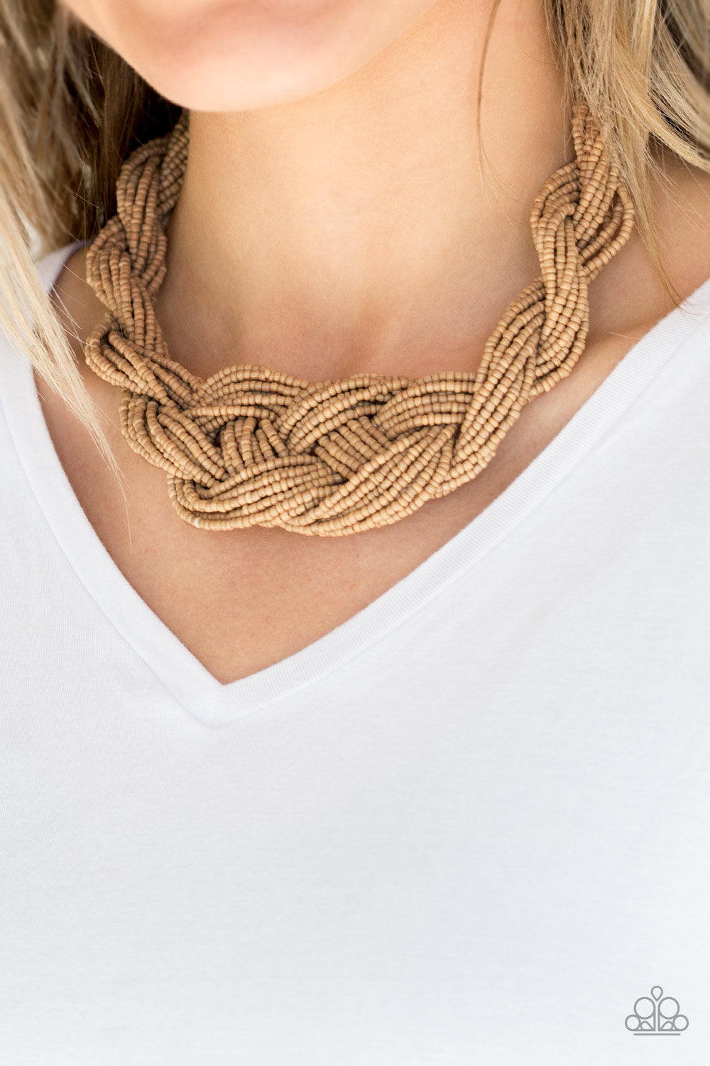 Innumerables tiras de cuentas de semillas marrones se trenzan y se anudan para crear una pieza llamativa e inolvidable. Cuenta con un cierre de broche ajustable.