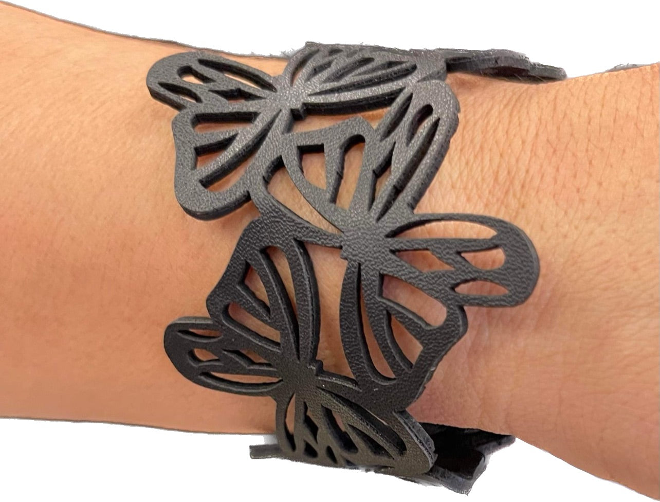 Con un diseño aireado con plantillas, mariposas de cuero negro revolotean por la muñeca mientras se conectan delicadamente para formar una pieza central colorida. Cuenta con un cierre a presión ajustable.