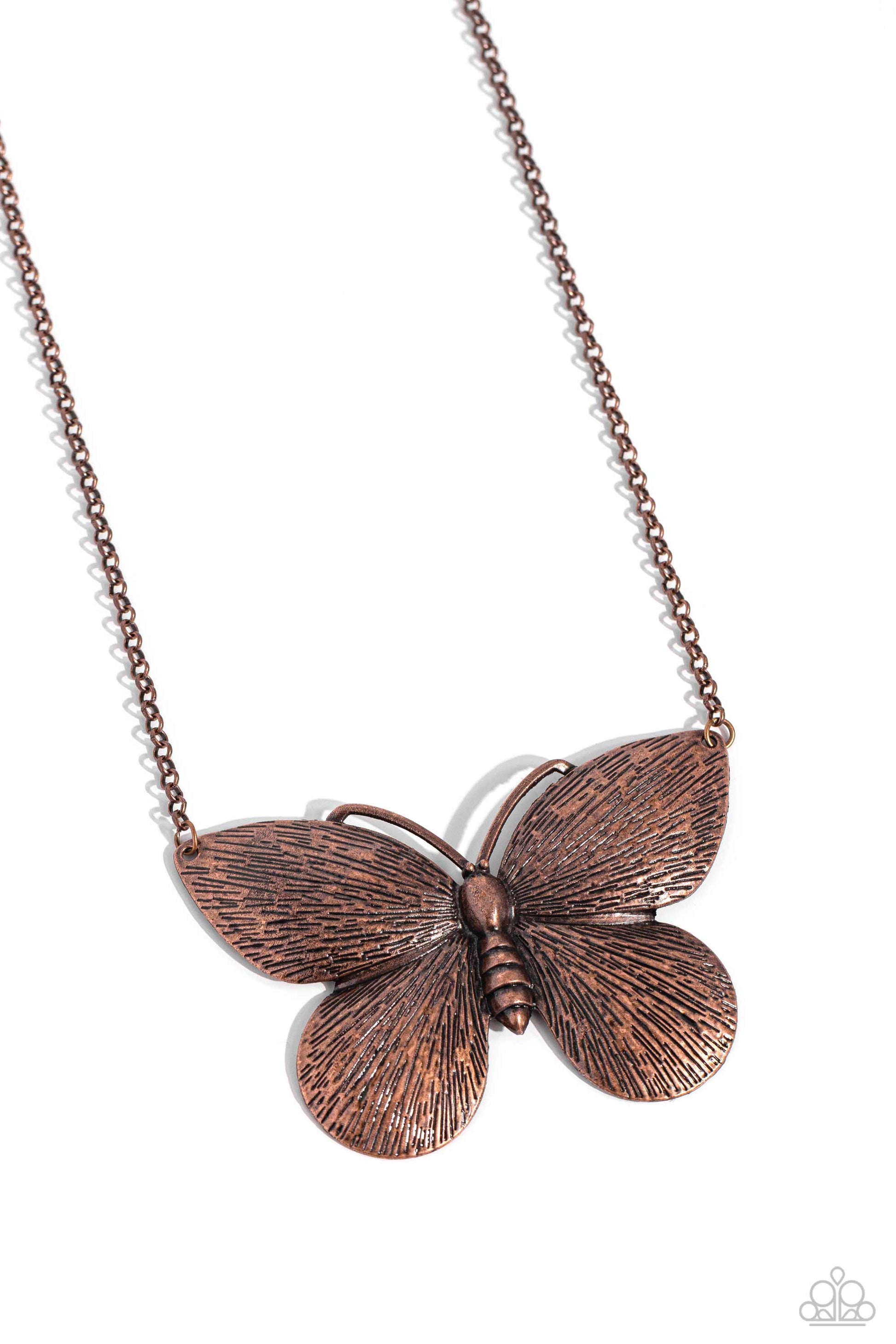 Cepillada con una textura lineal, una placa de polilla de cobre exageradamente grande revolotea a lo largo de una cadena de cobre debajo del collar para darle un toque encantador. Cuenta con un cierre de broche ajustable.