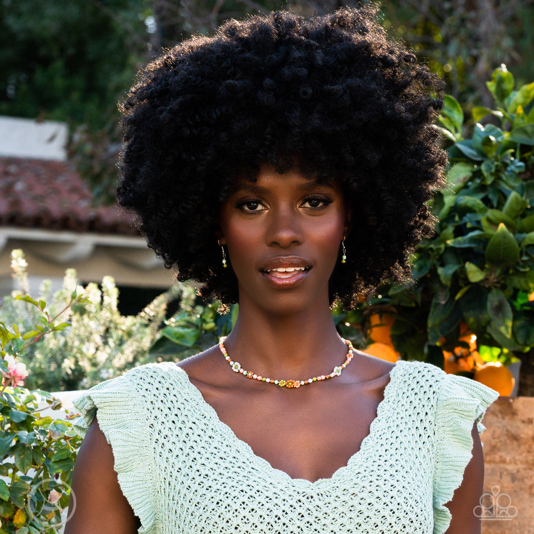 Las cuentas de semillas multicolores y los detalles plateados se enhebran a lo largo de un alambre y caen a lo largo del collar en un patrón caprichoso. Las flores de cuentas de semillas blancas, oliva, verde claro, rosa claro, coral y marrón de diferentes tamaños florecen entre los brillantes toques de color. Cuenta con un cierre de broche ajustable.