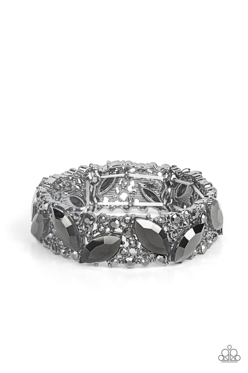 Los diamantes de imitación de hematita de corte marquesa de gran tamaño brillan sobre marcos humeantes de delicados tachuelas de bronce y diamantes de imitación de hematita que se enhebran a lo largo de bandas elásticas alrededor de la muñeca para un deslumbramiento asombroso.