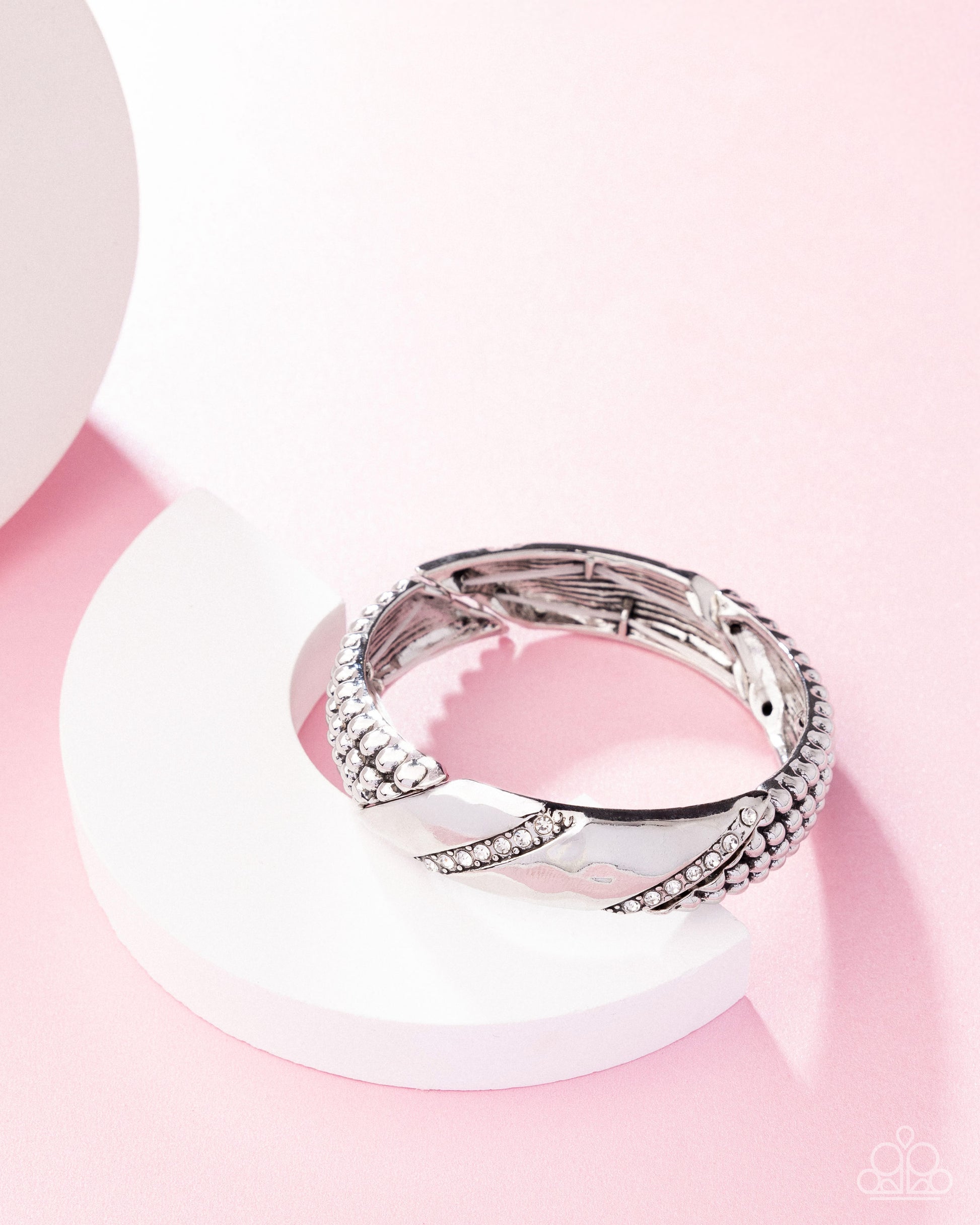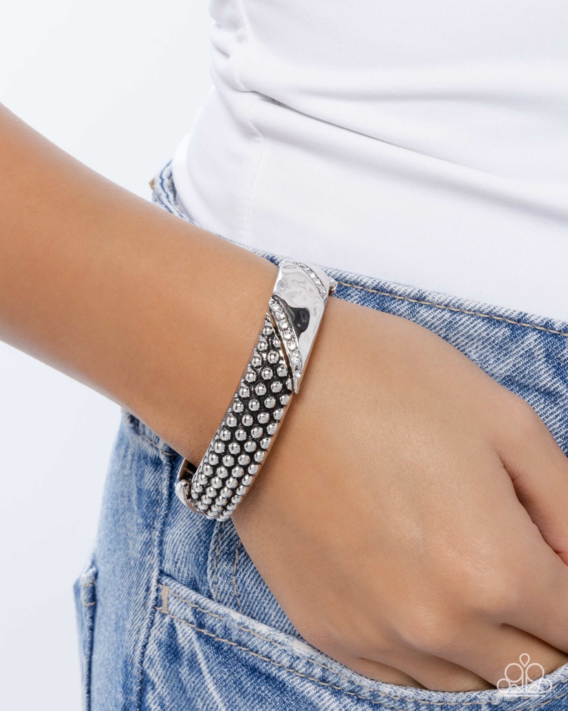 Infused along elastic stretchy bands, a collection of subtly hammered chiseled silver frames alternate with silver stud-layered chiseled frames for a dynamically dominant display. Stripes of white rhinestones dot along the hammered frames for additional grungy glitter.
