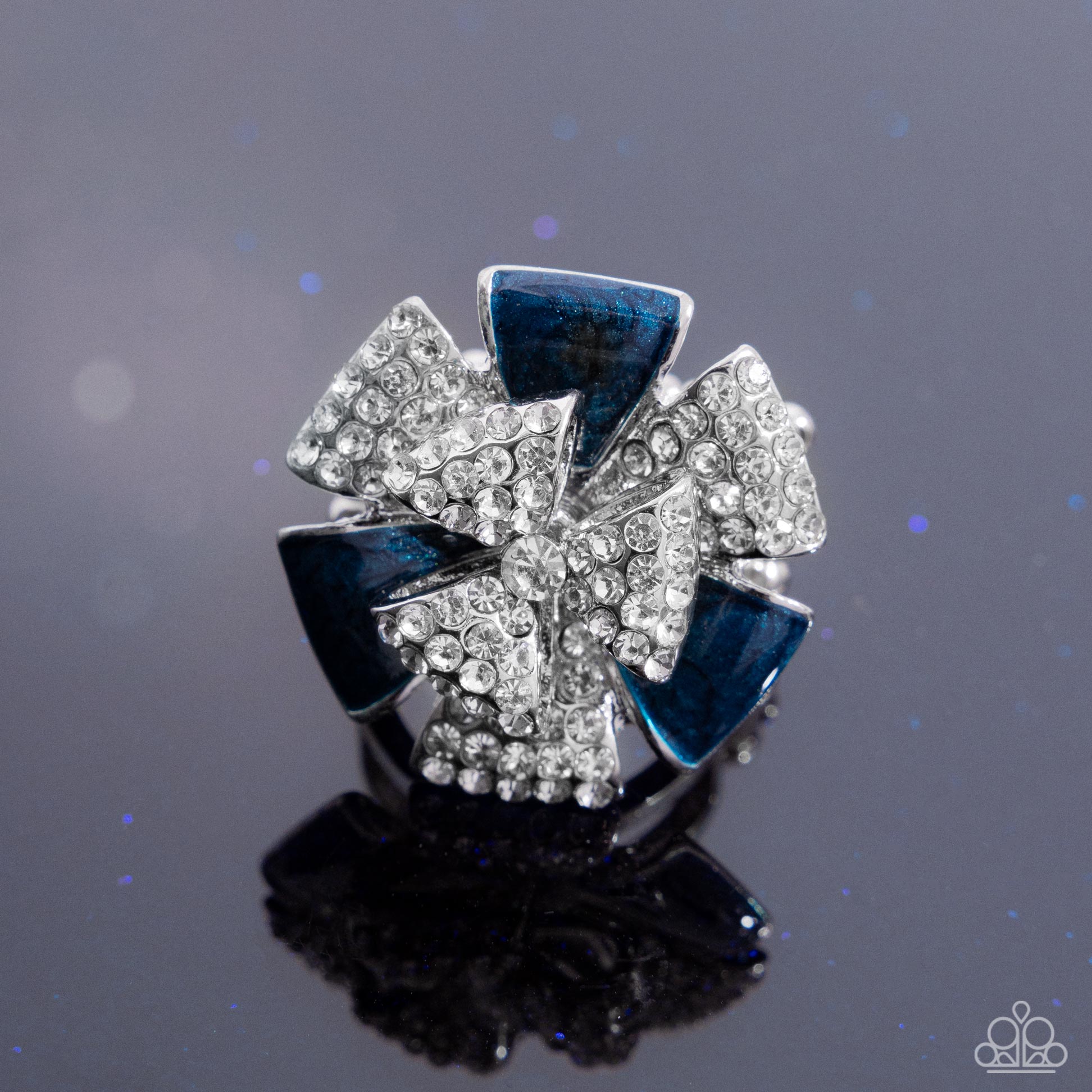 A cluster of silver ribbon-like petals fans out to create a floral-inspired design. Each petal alternates with shimmery, blue-painted petals and sparkling white rhinestones, with a single rhinestone resting at the center. Features a stretchy band for a flexible fit.