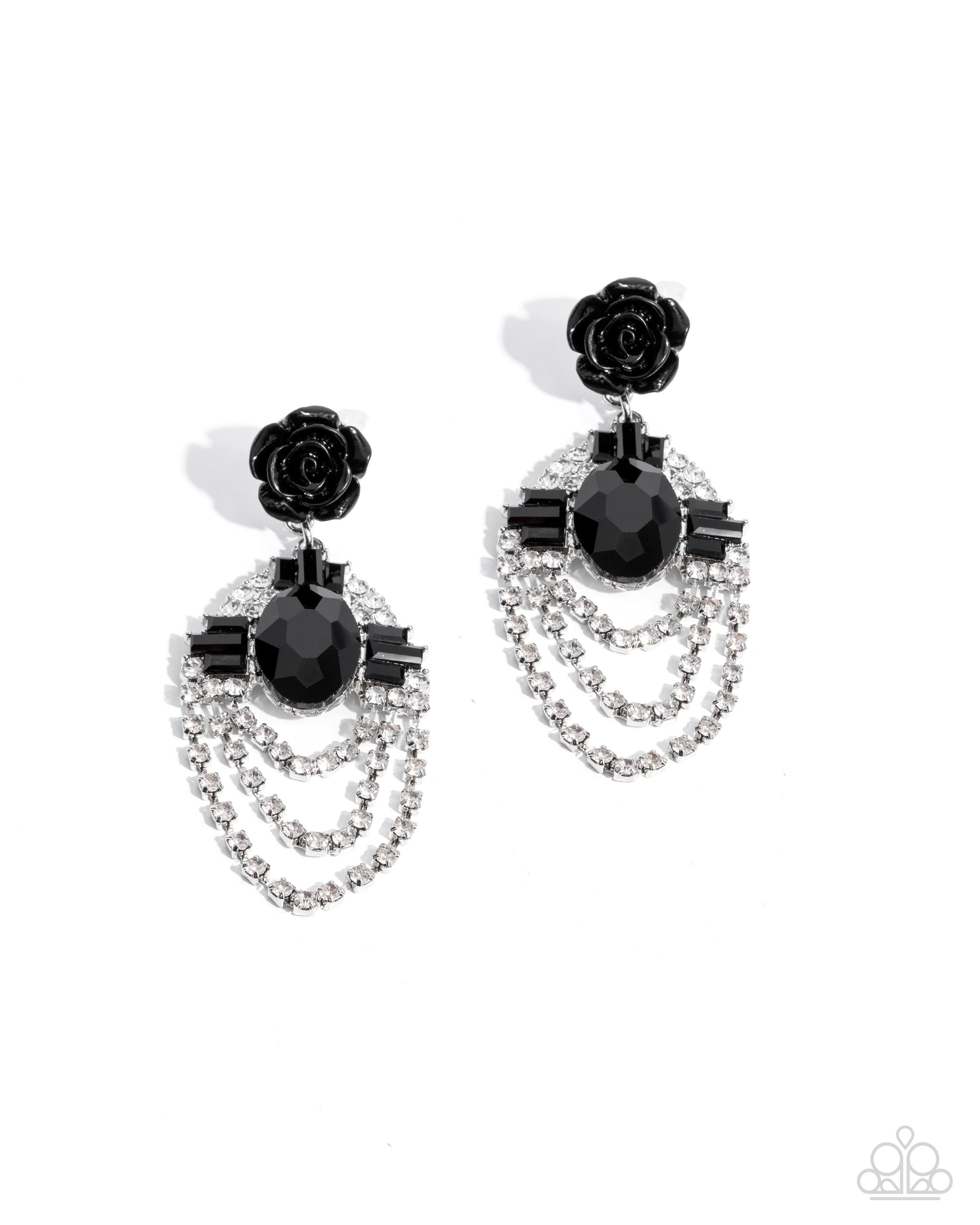 Con un tono negro, un poste con roseta brillante da paso a capas de diamantes de imitación blancos en accesorios cuadrados de plata unidos por tríos de gemas negras talladas en esmeralda que rodean una gema ovalada negra facetada para lograr un estilo romántico y rebelde. El pendiente se fija a un poste estándar.