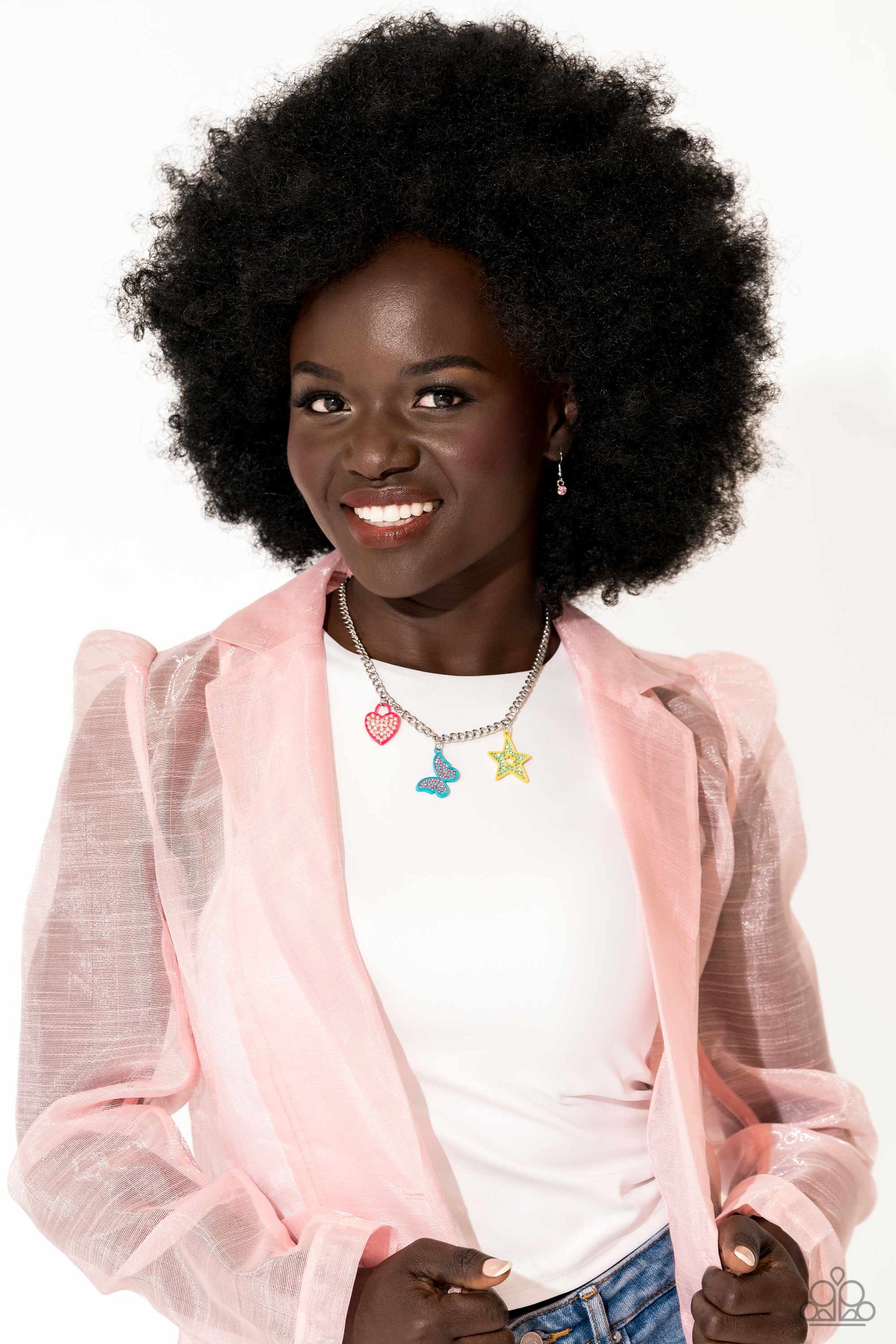 Una estrella pintada de alta visibilidad, una mariposa pintada de turquesa y un corazón pintado de pavo real rosa se balancean a lo largo de una cadena de plata clásica y bailan a lo largo del pecho para una declaración sensacional. Cada forma está incrustada en aguamarina, rosa claro y diamantes de imitación iridiscentes para un simple toque de brillo. Cuenta con un cierre de broche ajustable. Debido a su paleta prismática, el color puede variar.