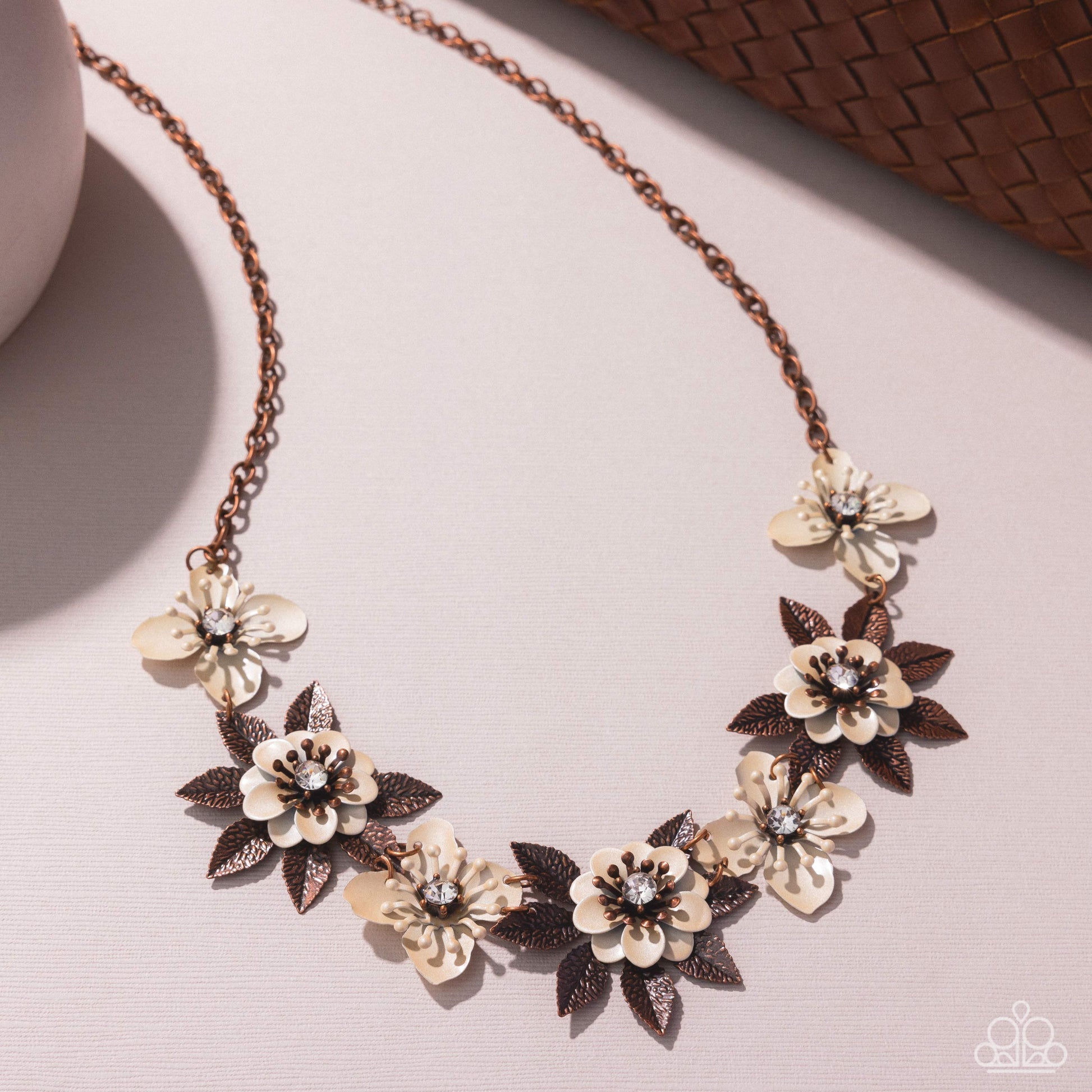 Conectadas a una cadena clásica de cobre, una colección de flores pintadas de color crema perlado con centros de diamantes de imitación blancos y filamentos tachonados de blanco se alterna con pétalos en capas pintados de color perlado con centros tachonados de cobre y centros de diamantes de imitación blancos, con hojas de cobre texturizadas que enmarcan el diseño para una exhibición extravagante y exagerada. Cuenta con un cierre de broche ajustable.