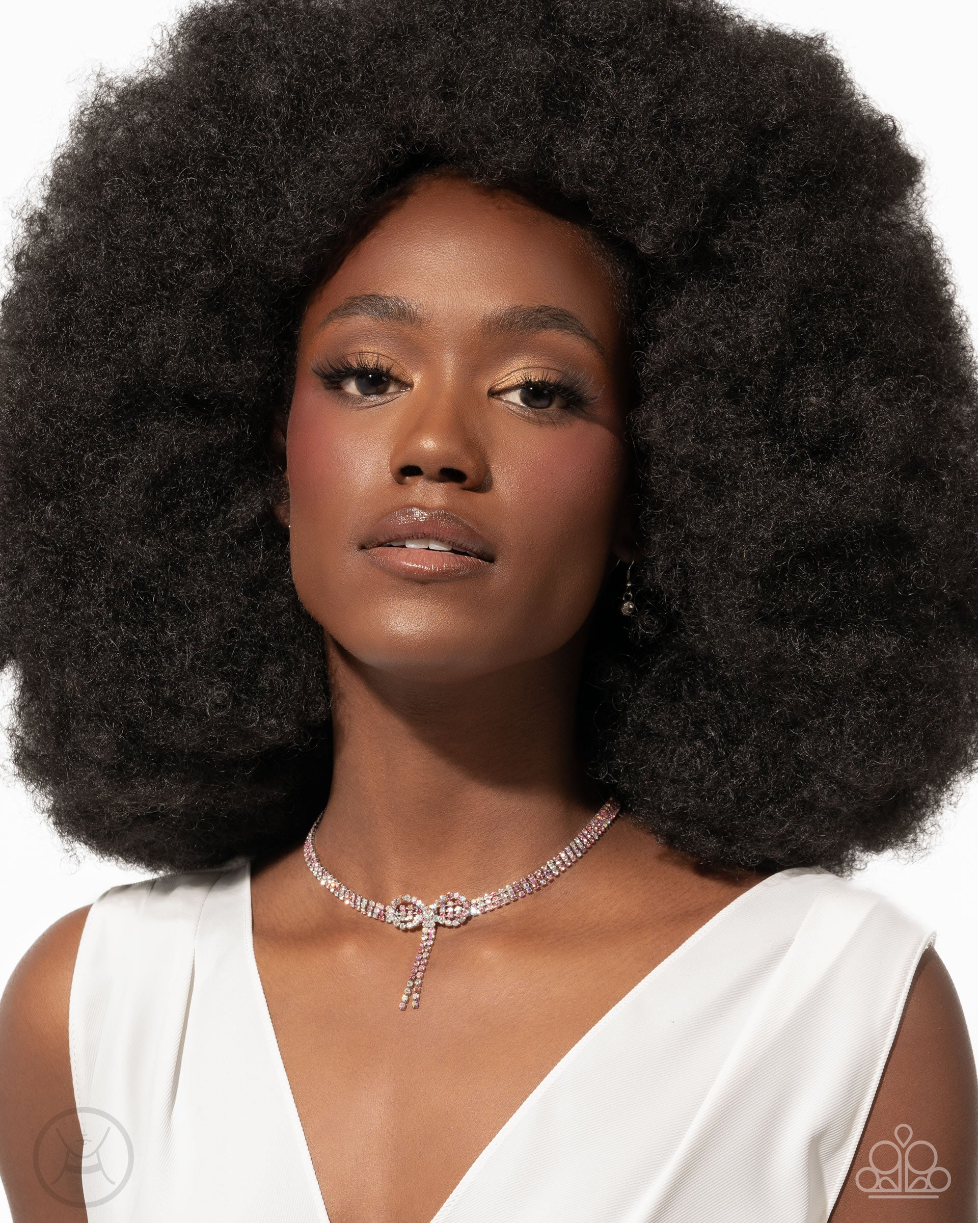 Embellished with a trio of glistening multicolored and iridescent pink rhinestones, silver squared rows of shimmery color loop along the collar. Also made up of pink multicolored and iridescent rhinestones, a silver bow loops and cascades along the center of the design for a refined finish. Features an adjustable clasp closure. Due to its prismatic palette, color may vary.