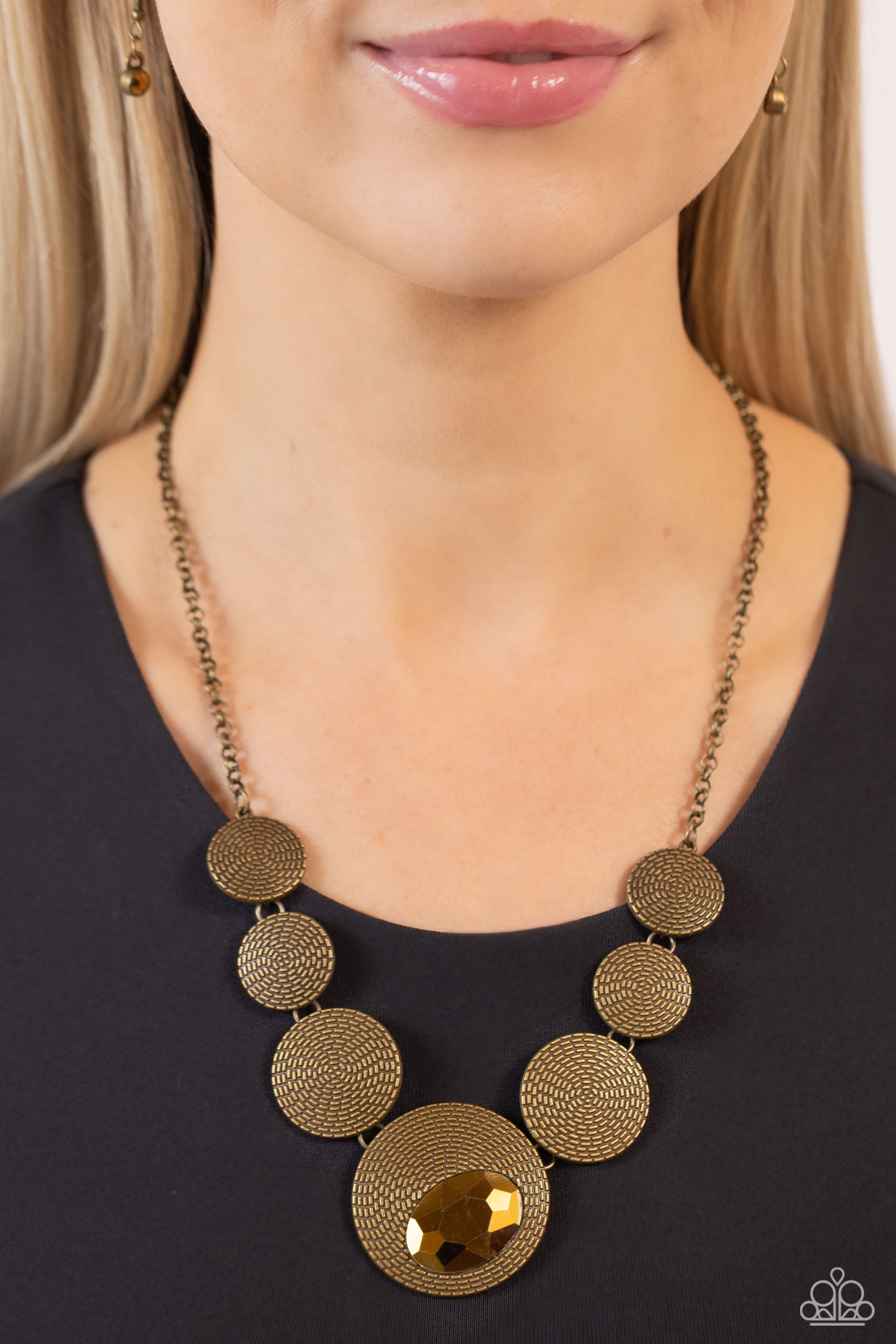 Embossed in an elongated dotted motif, a rustic collection of brass discs in varying sizes ruggedly links below the collar for an artisan inspired fashion. A faceted, oval, aurum gem sits at an angle on the biggest disc for a dauntless pop of color against the neckline. Features an adjustable clasp closure.
