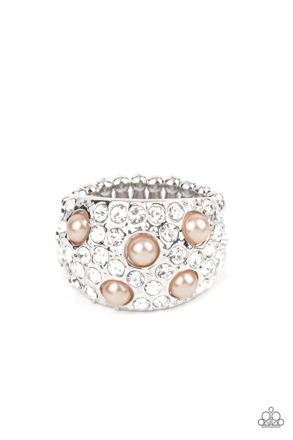 An explosion of dainty white rhinestones and bubbly brown pearls are encrusted across the front of a thick silver band, creating a glamorous centerpiece atop the finger. Features a stretchy band for a flexible fit.