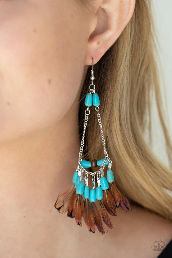 Infused with a wooden accent, an earthy assortment of teardrop turquoise stone beads and dainty brown feathers create a free-spirited fringe at the bottom of a shimmery silver chain teardrop for a wildly wonderful finish. Earring attaches to a standard fishhook fitting.