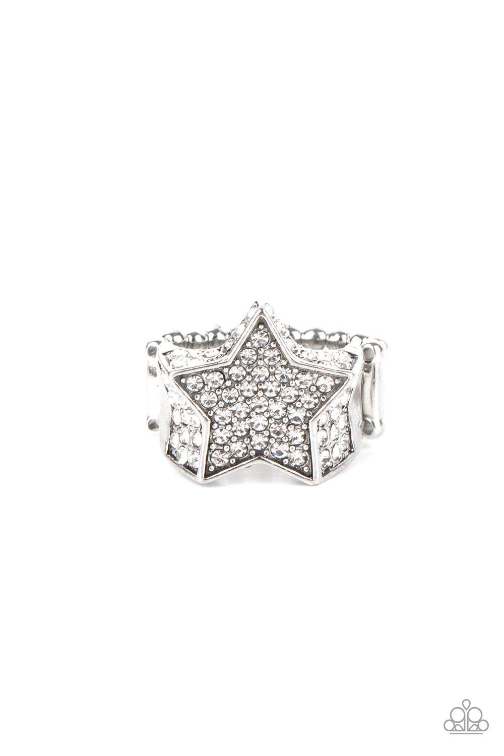 N Encrusted in glittery white rhinestones, a sparkly silver star joins with a thick band of blinding white rhinestones. The edges of the star are embellished in additional white rhinestones, creating a stellar centerpiece atop the finger. Features a stretchy band for a flexible fit.