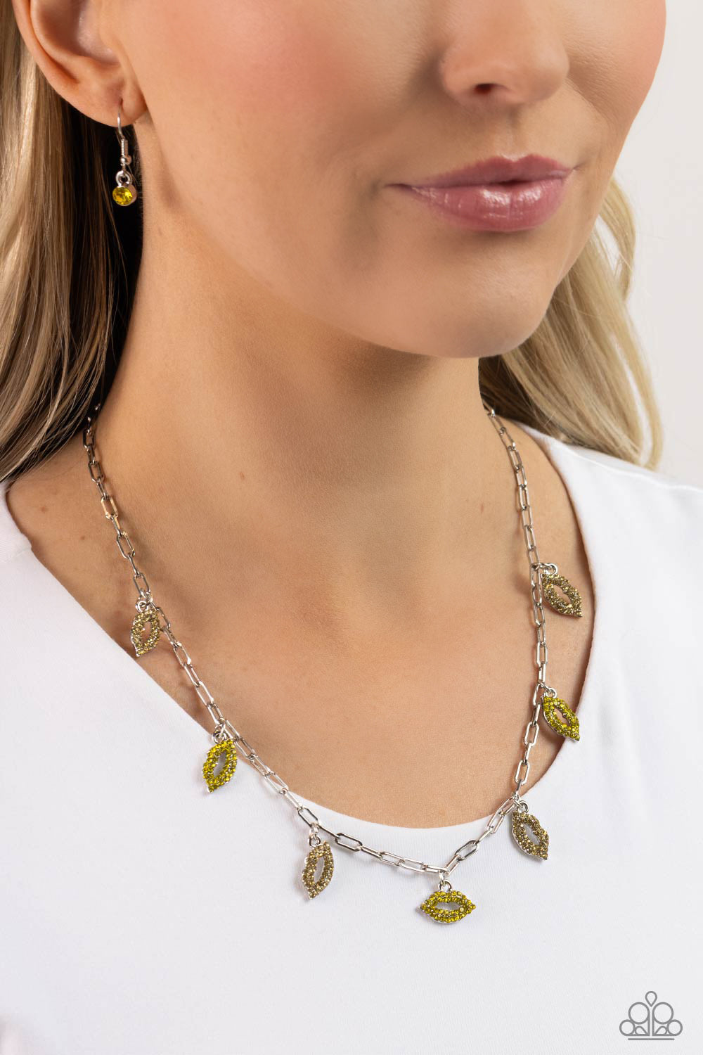 Gliding along a silver paperclip chain, a pouty collection of lip charms, each embossed in light and dark yellow rhinestones alternates below the collar for a love-struck fashion. Features an adjustable clasp closure.