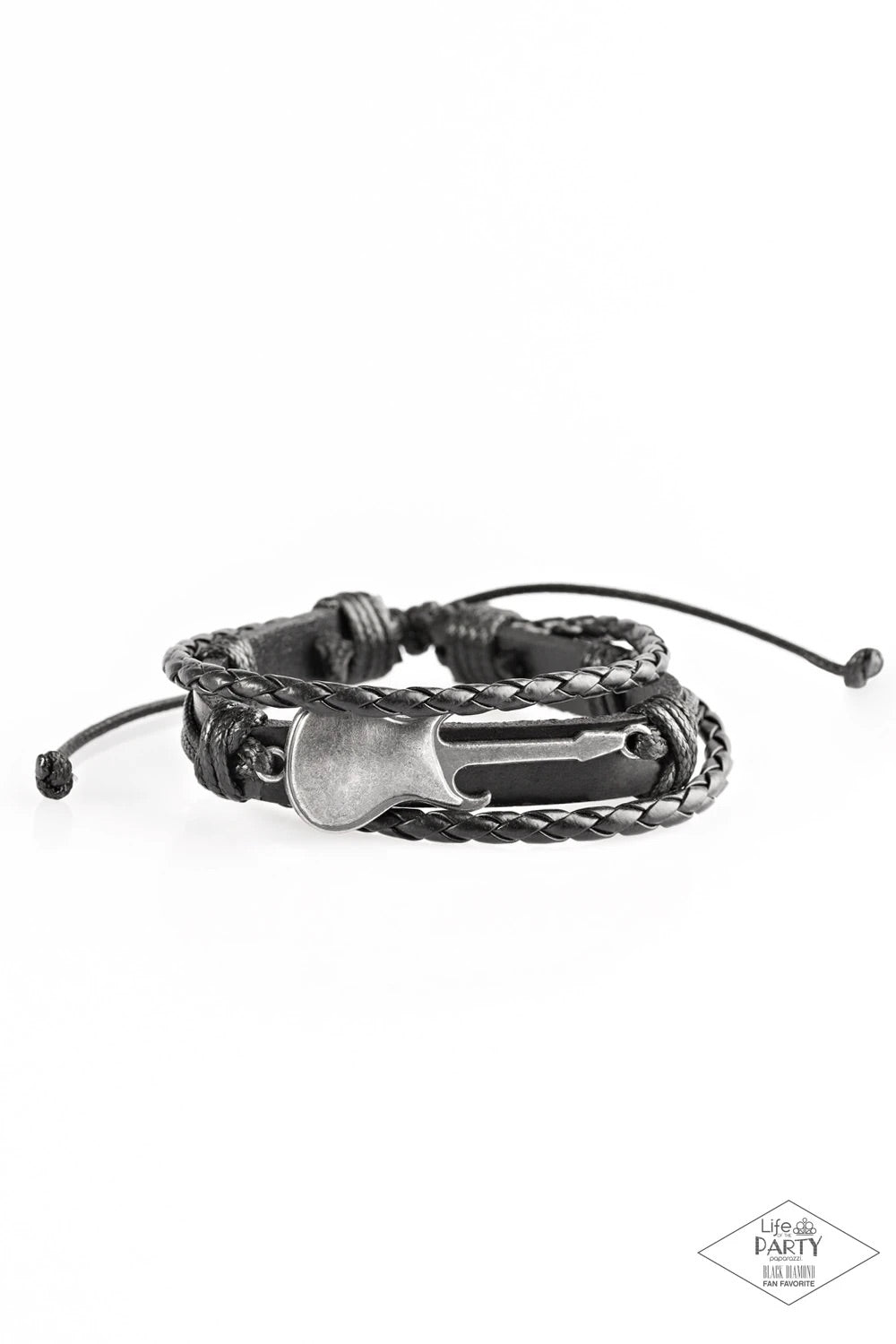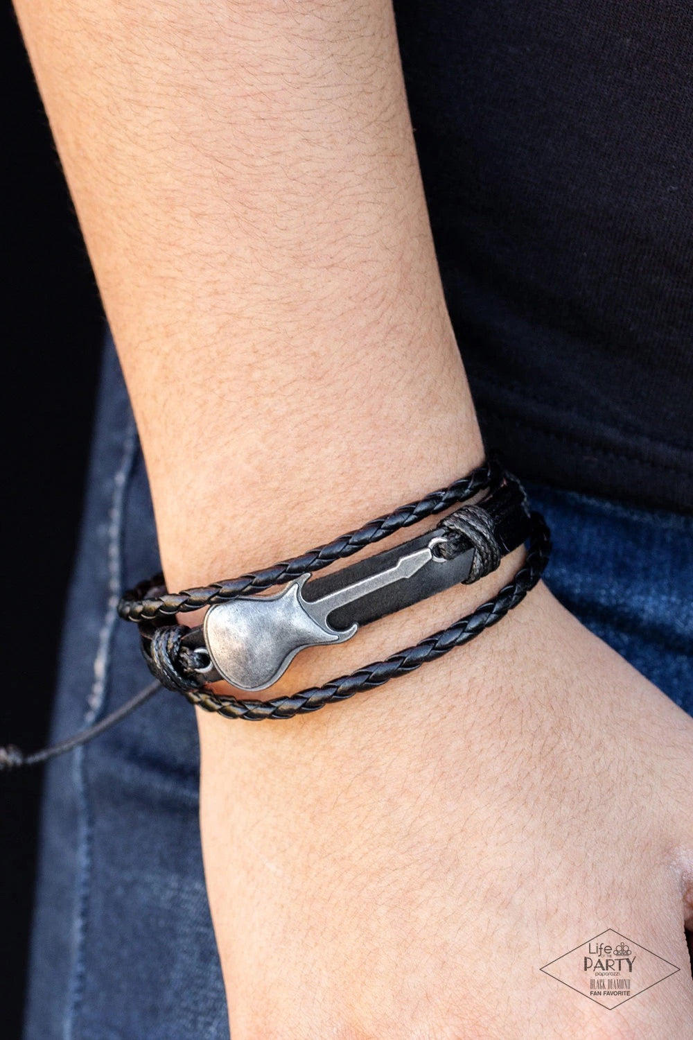Two strands of braided leather cording join a rustic black leather band around the wrist. Shiny black cording wraps around a metallic guitar charm, knotting the centerpiece in place for an urban finish. Features an adjustable sliding knot closure.