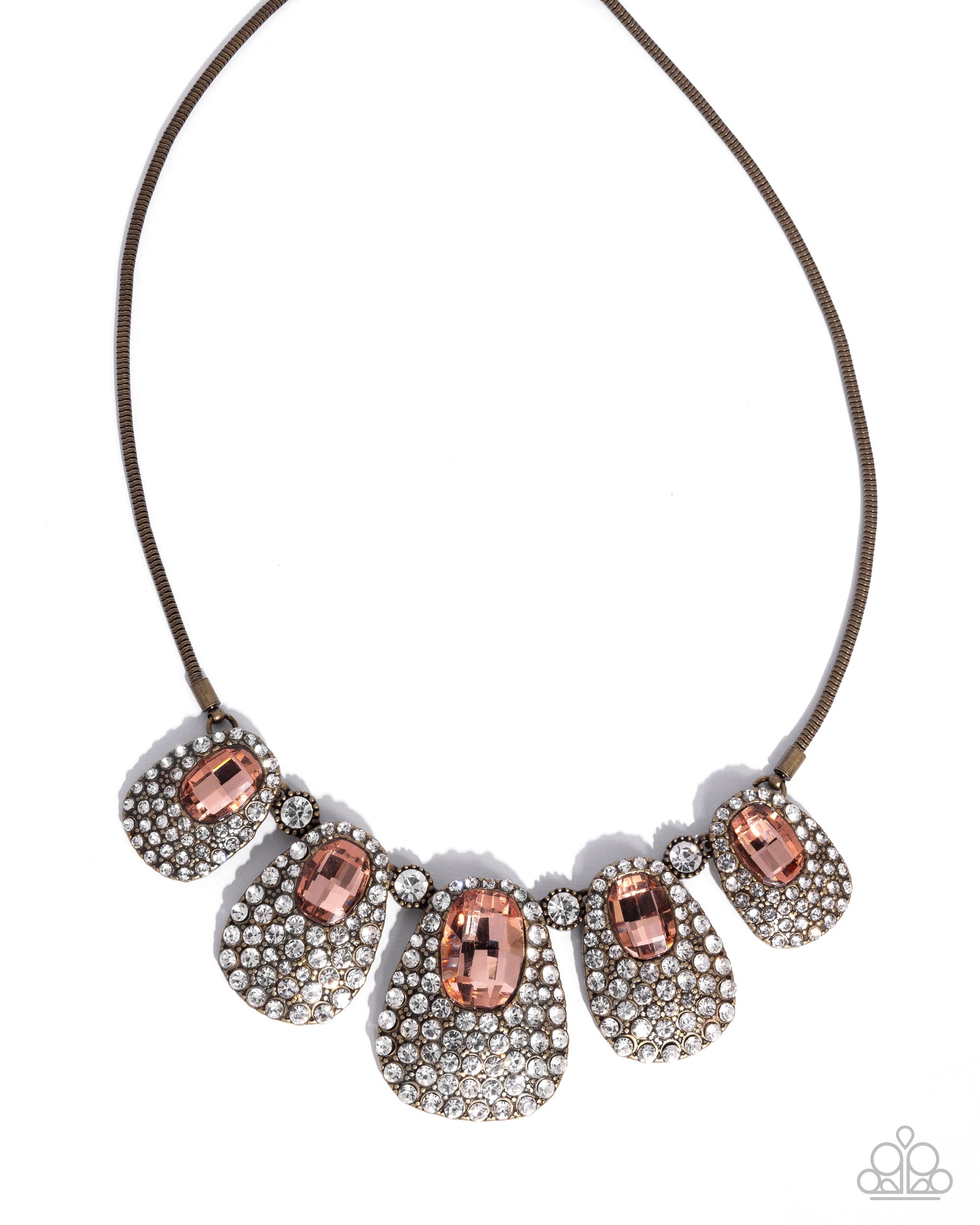 Exploding in shimmer, a collection of rounded brass pendants and white gems pressed in studded fittings link and alternate below the collar for an edgy statement-making look. Set in each frame, faceted, elongated oval peach gems add a dramatic pop of color to the design. Features an adjustable clasp closure.