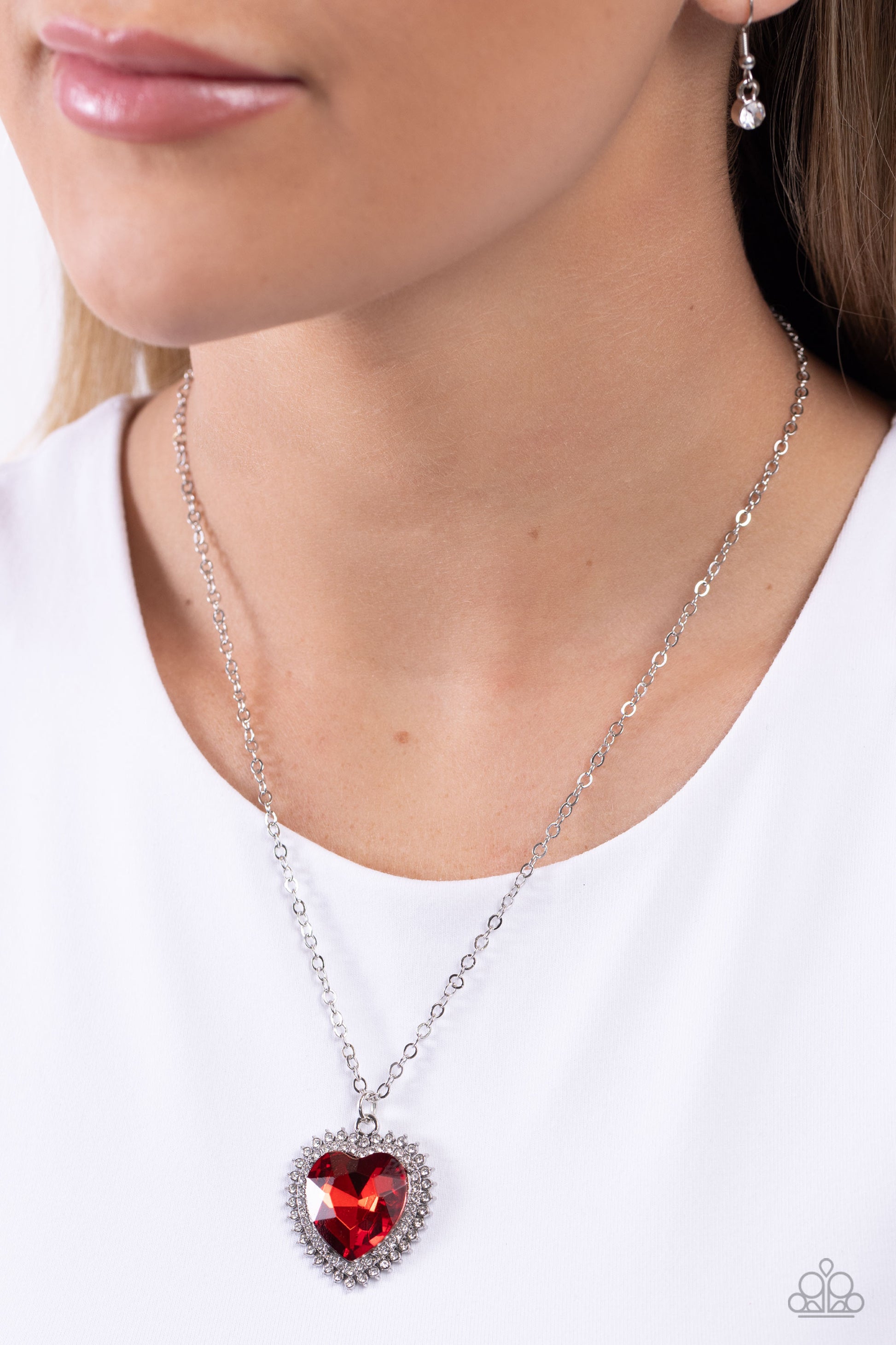 A red crystal-like heart gem sparkles dramatically as it's wrapped in a glassy white rhinestone-studded heart frame. Adding additional shimmer, a second layer of white rhinestones encircles the studded pendant as it swings from a classic silver chain in a flirty finish. Features an adjustable clasp closure.