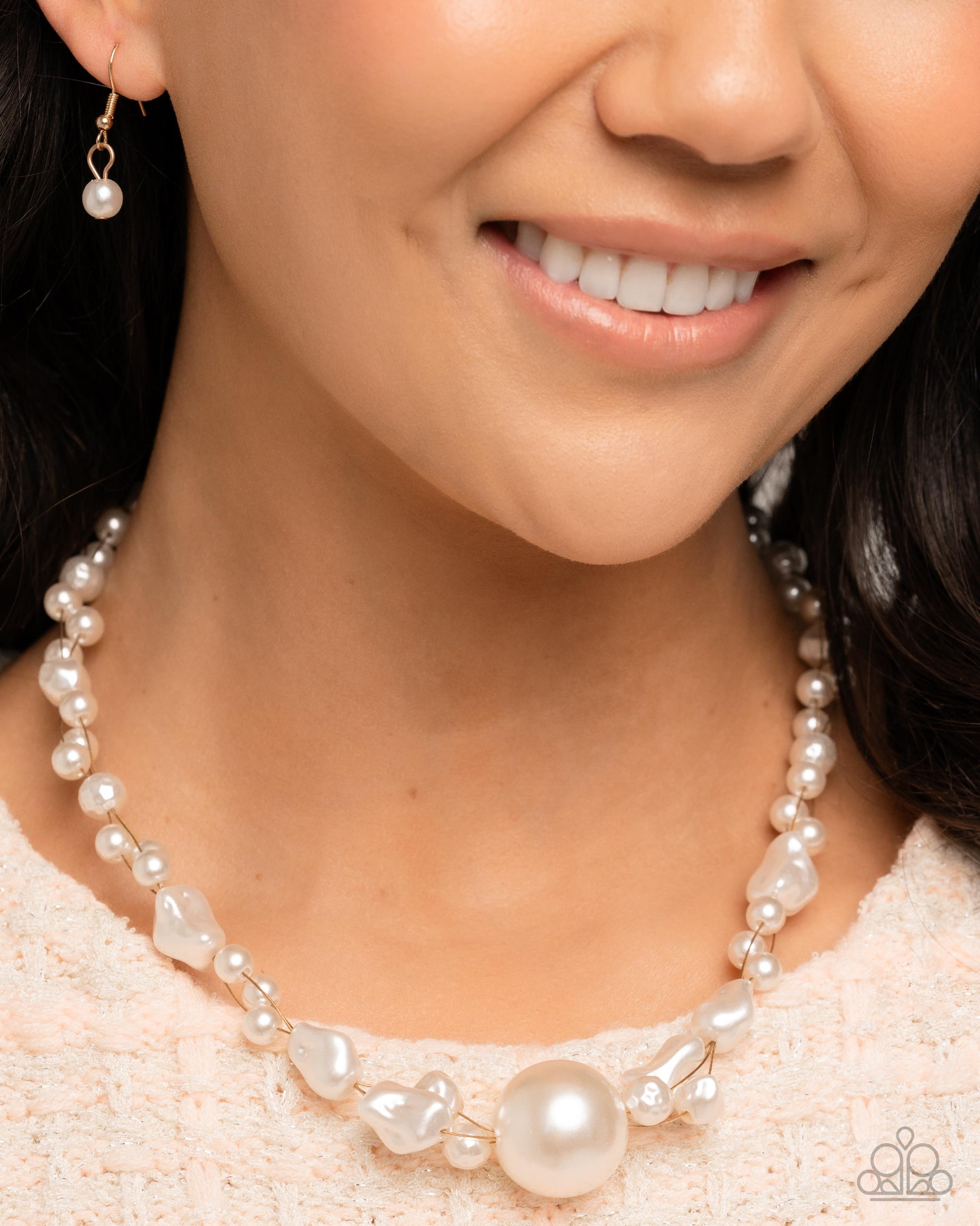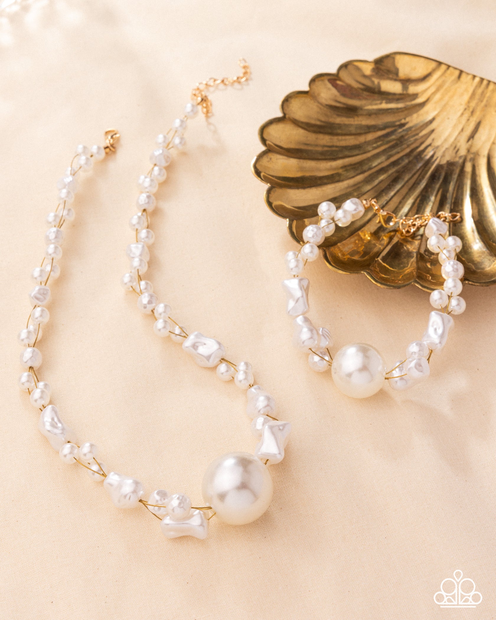 Infused along a trio of dainty gold wires, a collection of classic and baroque white pearls in varying sizes coalesce around the collar, leading the eye to an oversized round white pearl for an opulent, refined display. Features an adjustable clasp closure.